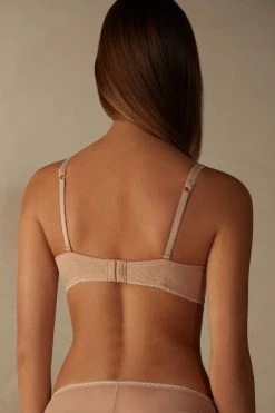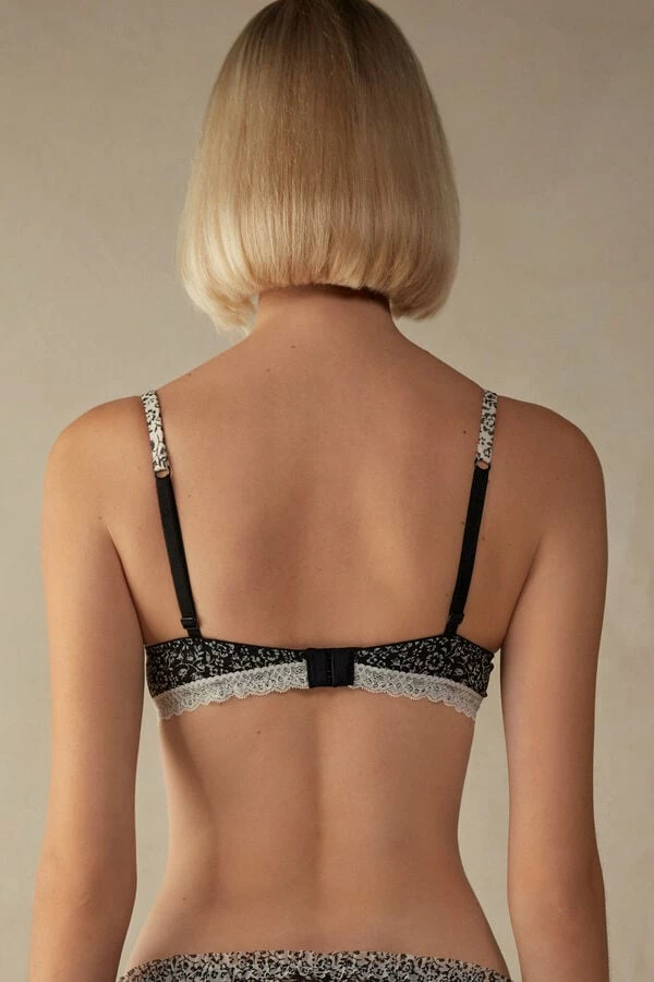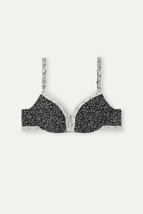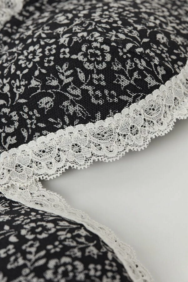 Gioia super push-up bra without underwire made with highly padded graduated preformed cups. Made of stretch tulle with a micro-flower pattern in shades of black and white, embellished with lace frills in a contrasting color. The straps are lined in tulle and are adjustable in back. Ideal model to obtain a two size larger volume effect and create a breathtaking dΓ©colletΓ©.