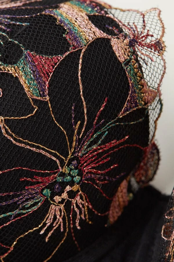 Sofia lightly padded underwire balconette bra. Made of embroidered tulle with multi-colored iridescent-like lamΓ© thread and trimmed with elegant satin details. Underbust is made of soft stretch tulle. Double braided straps with gold lamΓ© thread are adjustable in back. It is a design that provides optimal support and emphasizes the dΓ©colletΓ©, rounding the shape.