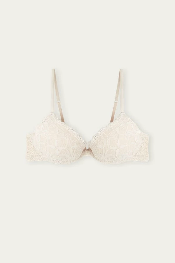 Bellissima push-up bra with underwire and lightly padded cups with interior cotton lining. The cups embrace the bust on the sides and shape the dΓ©colletΓ© with a light push-up effect. The straps are lined with microfiber and are adjustable in back. The band has interior tulle lining and the closure is two hooks high and four hooks wide. Made in soft and comfortable stretch lace that features a geometric design and romantic ruffles.