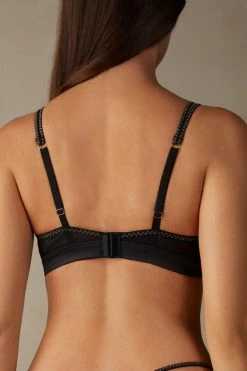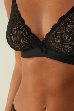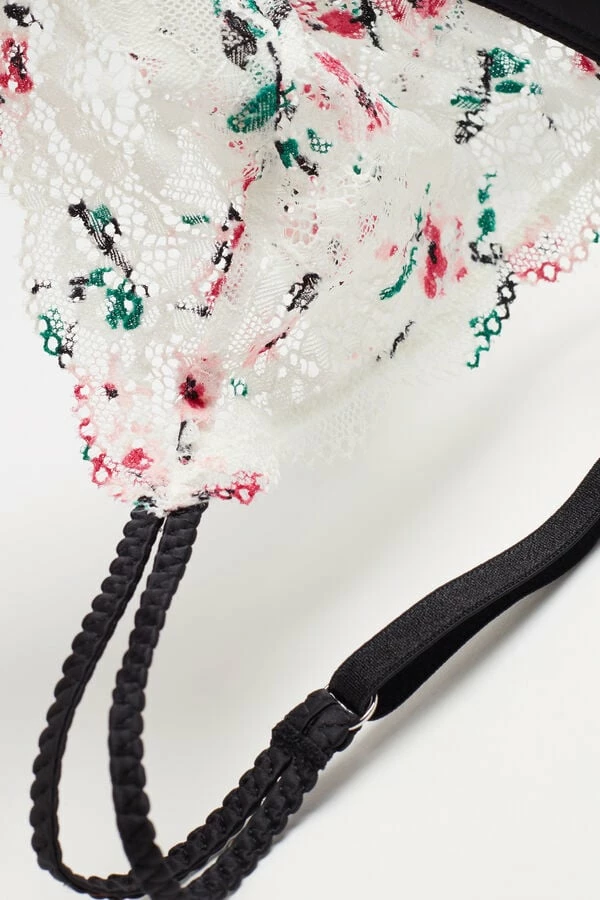 Unpadded wireless triangle bra with side boning that helps to curb the bust. Made in floral print lace with a pattern reminiscent of peach blossoms and is trimmed with contrast color satin trim. The braided satin straps are adjustable in back. It is the ideal bra for those looking for a natural effect with a romantic style.