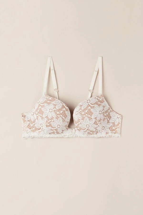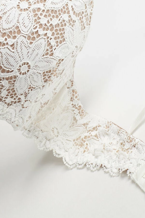 Monica underwire push-up bra with side boning made in soft crochet effect stretch lace. The elastic straps are fully adjustable with an elastic motif in back. Ideal to wear with deep necklines.