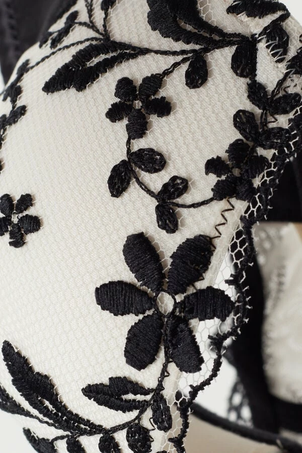 Lightly padded Sofia balconette bra with underwire, side boning and inner cotton cup. It is made with a romantic embroidered tulle with elegant satin trim. Underband in soft tulle trimmed with a contrast colored ruffle. The straps are lined in satin and adjustable in back. It is a design that provides optimal support and emphasizes the dΓ©colletΓ©, rounding out the shape and creating a romantic and feminine look.