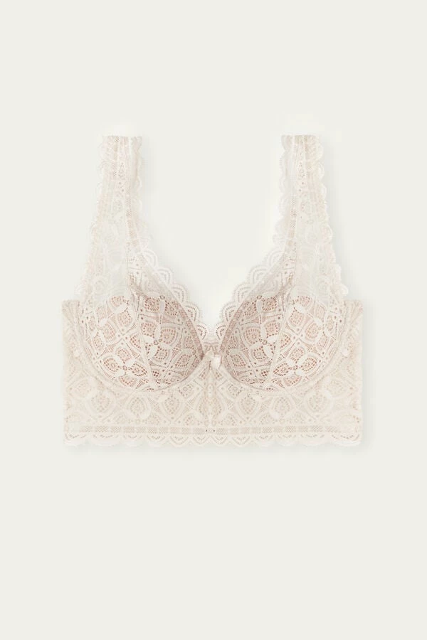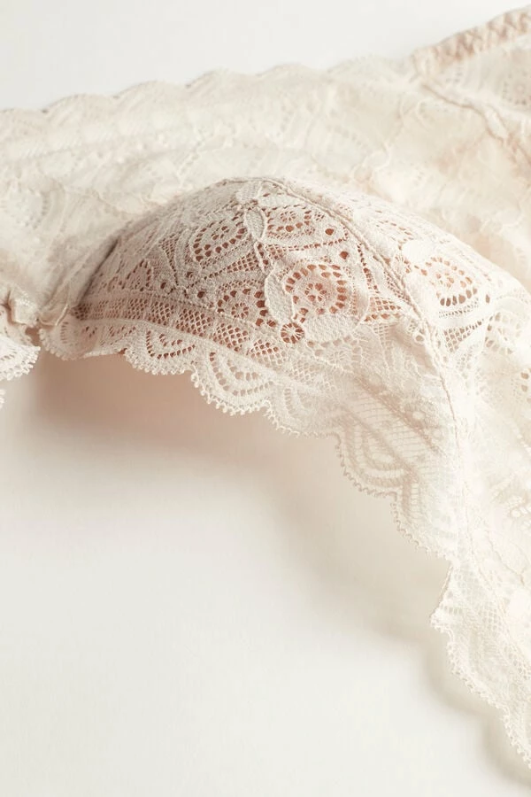 Eleonora balconette bra with underwire and semi-padded cups, lined in cotton, that provide soft support. It is embellished with a lace ruffle at the underband that creates a bralette effect and that makes it perfect to wear exposed with deep necklines or sheer clothing. The straps are adjustable in back. Made in soft and comfortable stretch lace that features a geometric design and romantic ruffles.