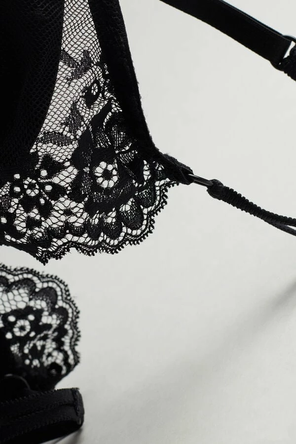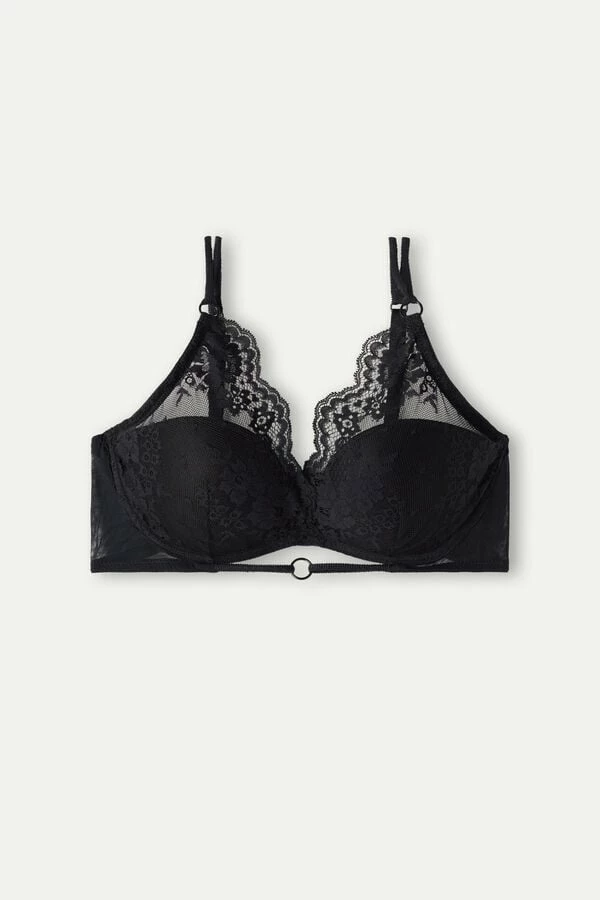 Giorgia balconette bra with underwire and cups with graduated padding that create a voluminous effect of one size larger. The cups are lined inside with cotton. Made in floral patterned elasticized lace and embellished with elasticized motifs with ring at the underband. The lined straps are adjustable in back. The deep V-neckline emphasizes the dΓ©colletΓ© and makes it the ideal bra for those looking for a sensual effect.