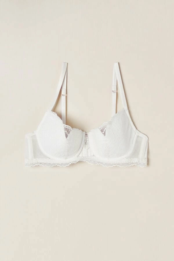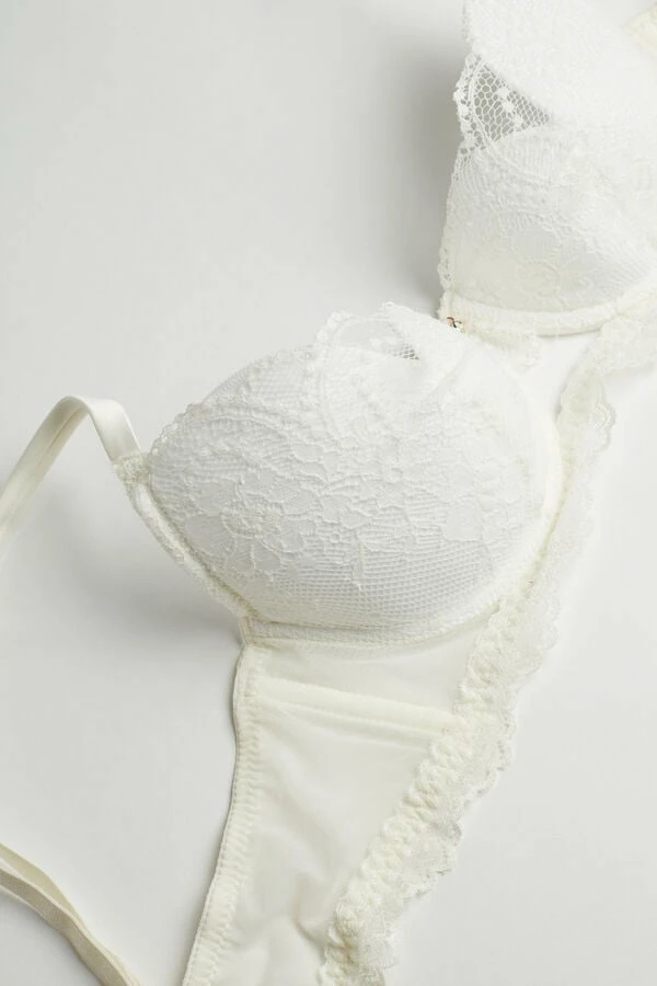 Demi bra made in lace and tulle with lightly padded cups, underwire, and side boning. It features luxurious details like an underband trimmed with a lace ruffle and a single rhinestone at the center of the bust. The straps are lined with satin and are adjustable in back. Low neckline design ideal to emphasize the décolleté.
