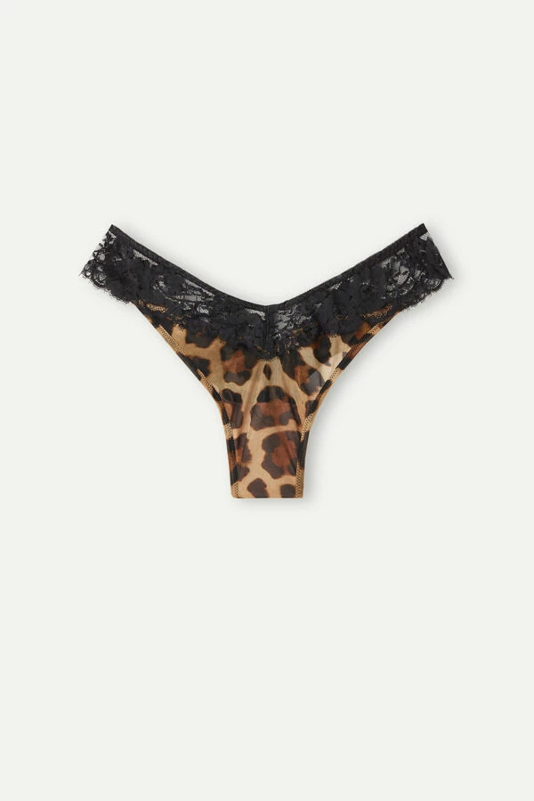 Spotted print stretch tulle โ80s style Brazilian panties with lace trim. Inner gusset in 100% cotton.