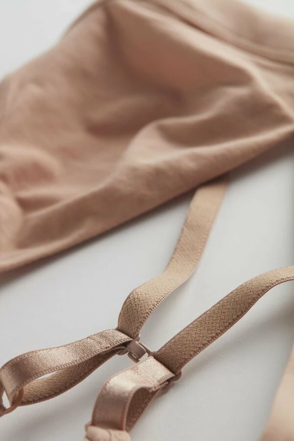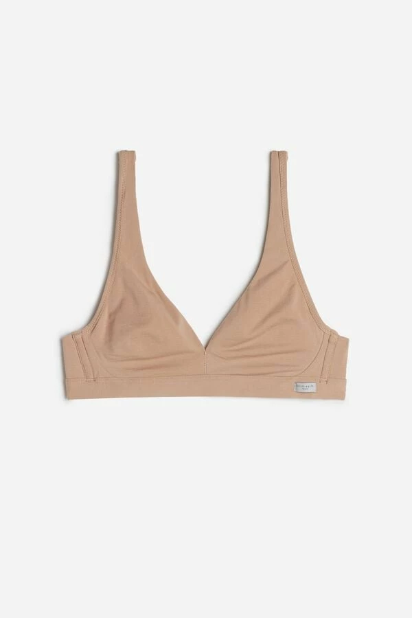 Lara triangle bra, wireless and unpadded, made of stretch cotton. Molded cup with lining that continues into the strap, with adjustable elastic in the back. The side boning and underband in cotton help support the bust. The strap adjusters feature a hook that can be used to cross the straps in the back. The cup has been reinforced inside with hidden mesh for added support and shaping for sizes 38C-40B-40C, with a layer of cotton against the skin.