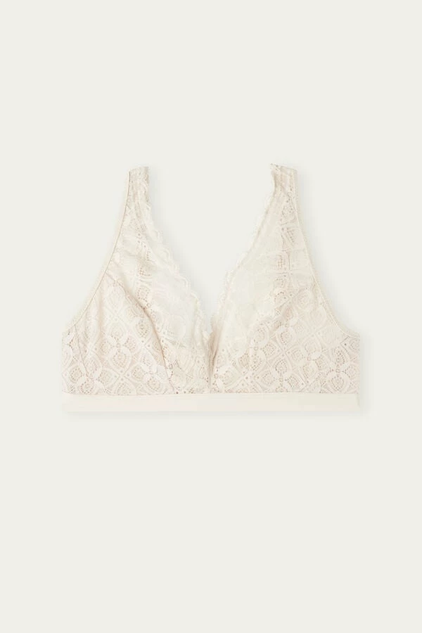 Lara triangle bra, wireless and unpadded. The lace cups have interior lining and sides in soft tulle. The side boning and underband in microfiber help support the bust. The band is lined with tulle for better support and the closure is three hooks high and four hooks wide. The straps are adjustable in back. For sizes 40C, 42B, and 42C, the cups have interior lining in order to guarantee better assistance and support of the bust. In the same sizes, inside the cups is found a reinforcement that begins at the straps and continues to the underband, specifically to give better support. Made in soft and comfortable stretch lace that features a geometric design and romantic ruffles. Very soft and comfortable design ideal for those looking for a natural but very feminine effect.