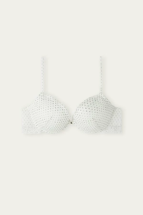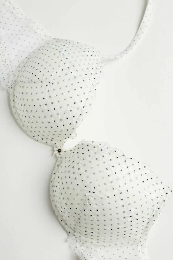 Bellissima push-up bra with molded cups, light padding, and underwire. Made in dot patterned tulle with floral embroidery and is embellished with charming ruching. The tulle lined straps are adjustable in back. Design that rounds the breasts and creates a light, full effect.