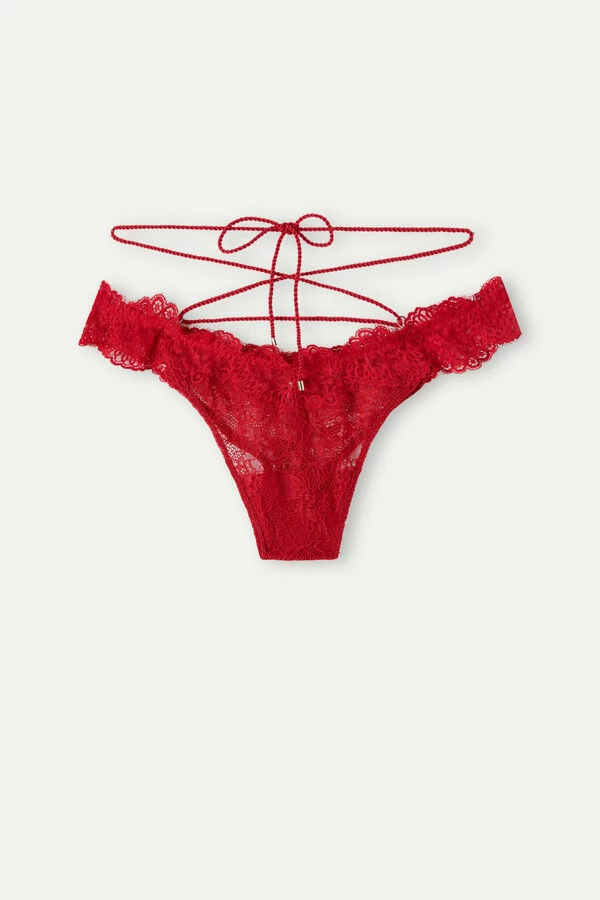 Brazilian in โ80s style made of floral design stretch lace. It features sensual details like a fully removable stretch cord and a ring that can be made into an intriguing crisscross design. Inner gusset in 100% cotton.