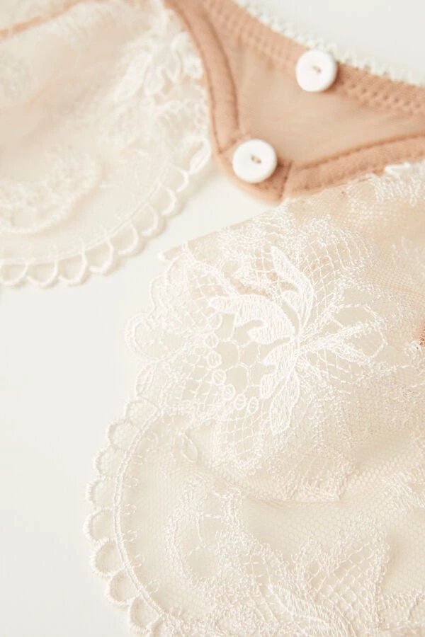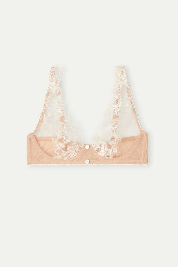 Underwire balconette bra made of a lightweight tulle in natural tones embellished with contrasting color embroidery that creates a romantic patterned effect on the skin. The lace cup continues on the straps which can be adjusted in back. Elegant satin-covered buttons in the centerfold. The bust is made of soft stretch tulle. Feminine and sensual model that enhances the natural shape of the bust. The model is 5โ9โ (175 cm) tall and is wearing a size 2B / 75B / 34B / 85B / 42B.