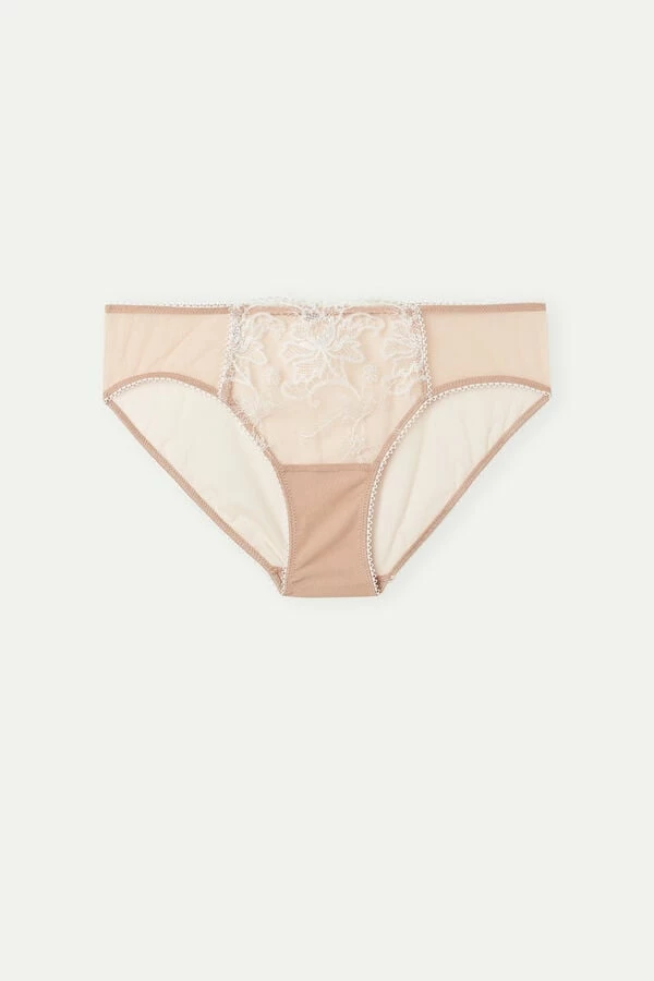 Briefs in tulle with natural tones embellished with contrasting color embroidery that creates a romantic patterned effect on the skin. Inner gusset in 100% cotton.