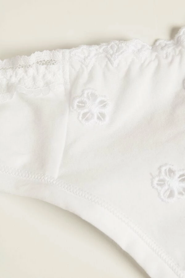 Brazilian in stretch cotton with Sangallo embroidery with a romantic floral motif. Romantic small ruffle trim with a floral motif. Inner gusset in 100% cotton.