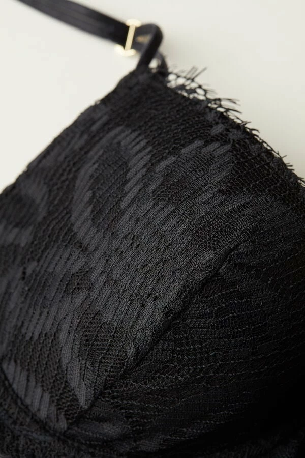 Balconette bra with underwire and lightly padded cups. It is made entirely of floral patterned stretch lace with a romantic and very feminine style. It features an elasticized motif at the straps embellished with a gold accessory. The straps are adjustable in back. A design that rounds the bust and highlights the dΓ©colletΓ© for a feminine and sensual style.