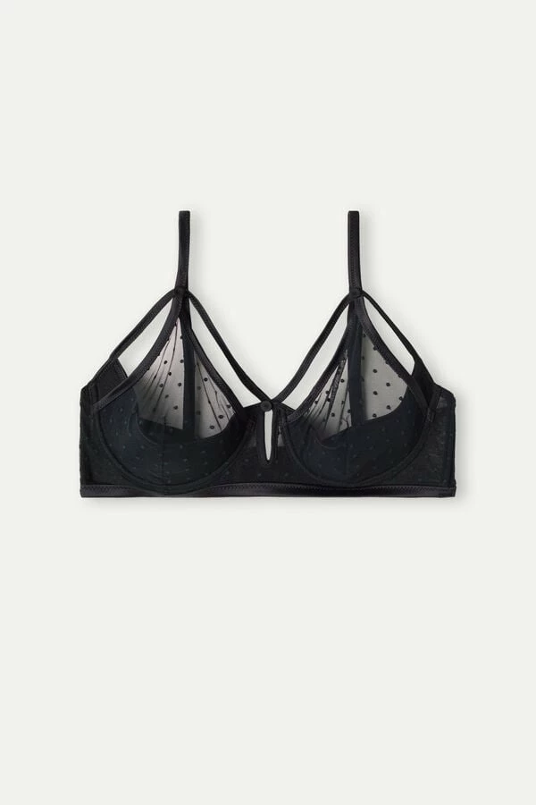 Demi bra with underwire and side boning. The dΓ©colletΓ© features a V-shaped wire at the center of the bust with a small button. It is made in soft dotted tulle trimmed with elegant satin details. The straps are lined with satin and are adjustable in back. Ideal bra for a sensual and feminine look.
