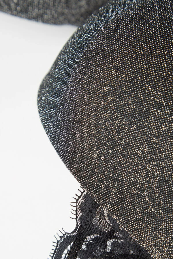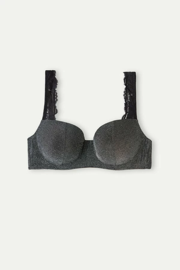 Sofia lightly padded underwire balconette bra with side boning. It is made with a silvery soft jersey with lamΓ©. The straps are lined with contrast color lace and are adjustable in back. It is a design that provides optimal support and emphasizes the dΓ©colletΓ©, rounding out the shape and creating a glamourous and feminine look.