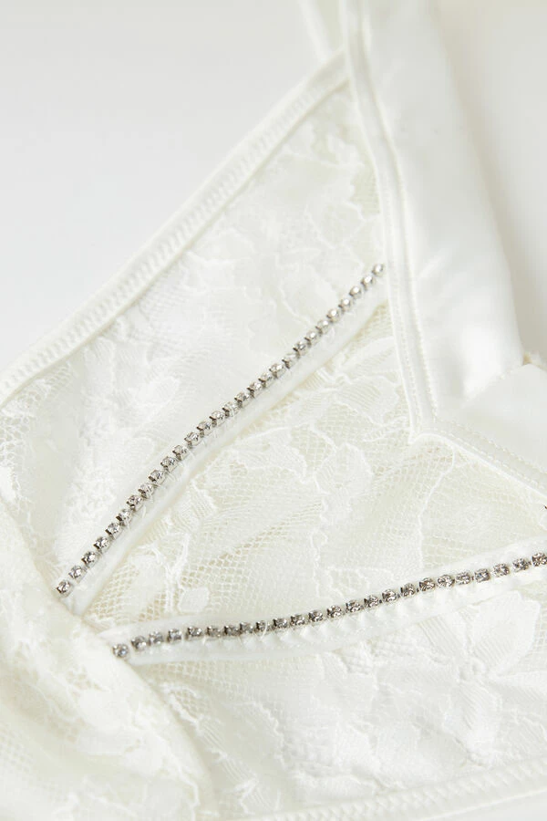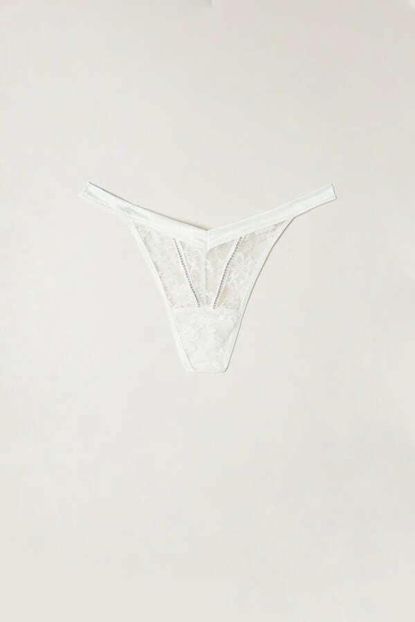 Thong in an 80s style made in floral stretch lace with satin waistband and trim. The rhinestones embellish the piece with a touch of light. Inner gusset in 100% cotton.