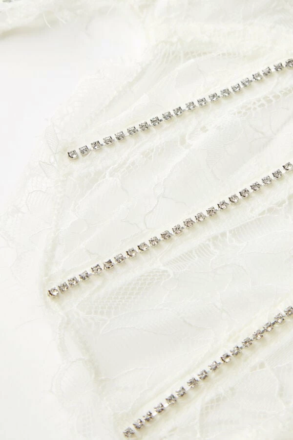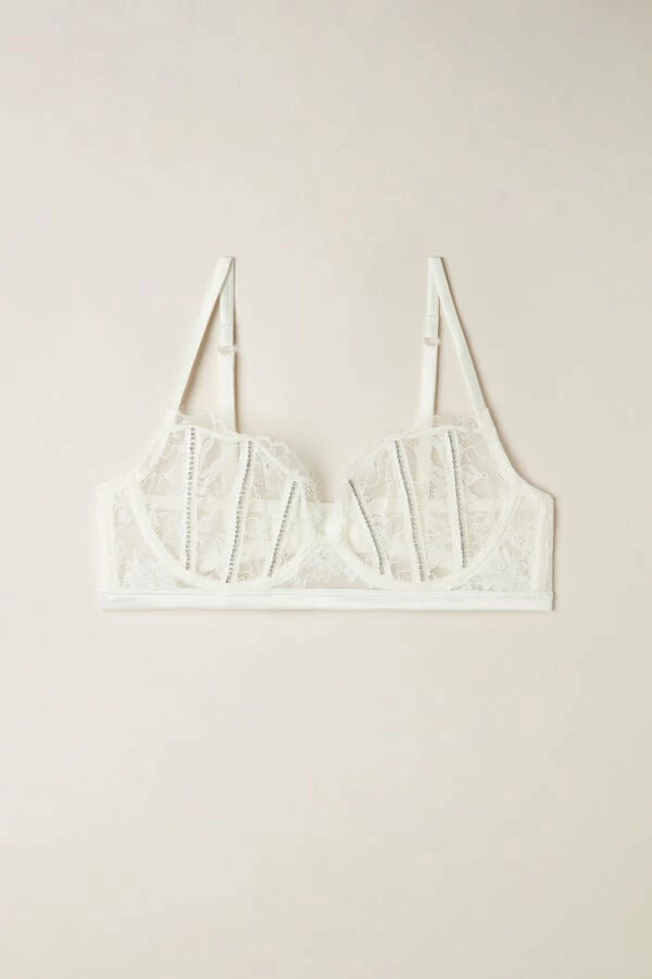 Balconette bra with underwire and side boning made in floral stretch lace with elegant satin trim. Soft, corset style ribs are found on the cups and embellished with rhinestones that give a touch of light and create a very glamourous style. The satin lined straps are adjustable in back. Design that gathers the bust and highlights the dΓ©colletΓ©.