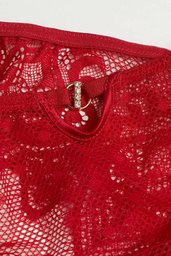 Panties with dotted mesh in the front and lace in back. Embellished with a small rhinestone jewel detail.