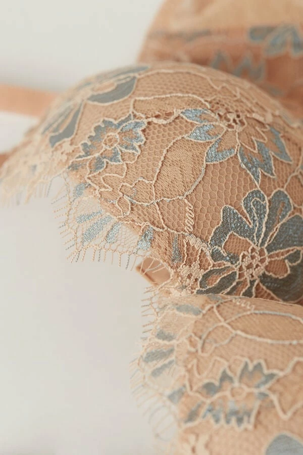 Lightly padded Sofia balconette bra with underwire, side boning and inner cotton cup. Made of a light and weightless two-tone lace that appears to create a pattern on the skin. Bust line is made of a soft, mesh-like effect stretch lace refinished with a scalloped trim. The straps are lined in satin and adjustable in back. It is a design that provides optimal support and emphasizes the dรฉcolletรฉ, rounding out the shape and creating a romantic and feminine look.