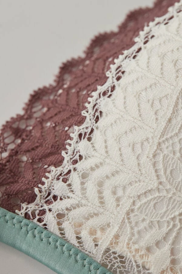 Tiziana triangle wireless bra with side boning and lightly padded cups with cotton inner lining. Made of soft stretch lace inspired by Eastern majolica with contrast color ruffle at the neckline and satin trim. Charming tassel at the center. Double braided look satin straps are adjustable in back. Romantic and playful style.