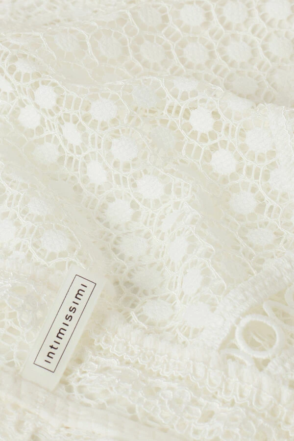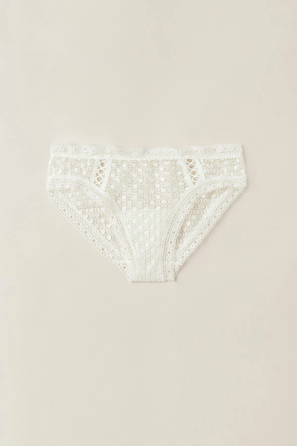 Panties made in soft crochet effect stretch lace embellished with ajour embroidery trim that is alluringly romantic. Inner gusset in 100% cotton.