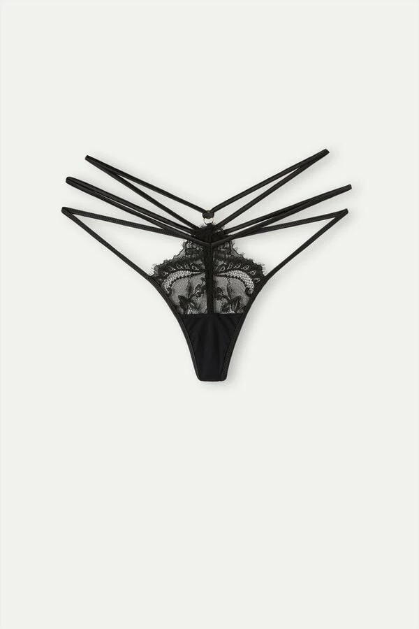 Thong in floral stretch lace with intriguing and sensual satin motifs embellished with small gold jewel effect rings. Inner gusset in 100% cotton.
