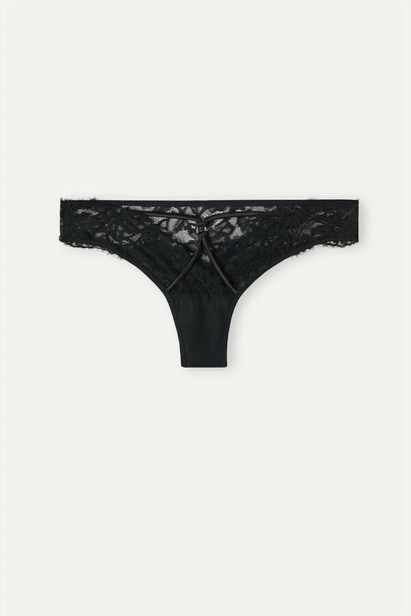 Brazilian in stretch lace with intriguing satin motifs in front embellished with small gold jewel effect rings. Back part in soft doubled tulle. Inner gusset in 100% cotton.