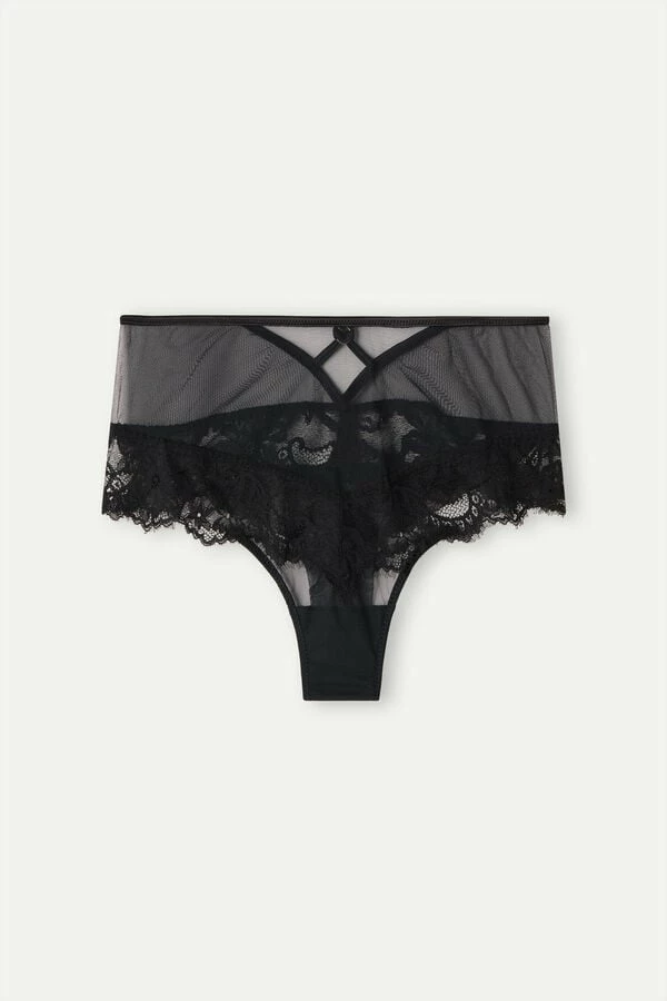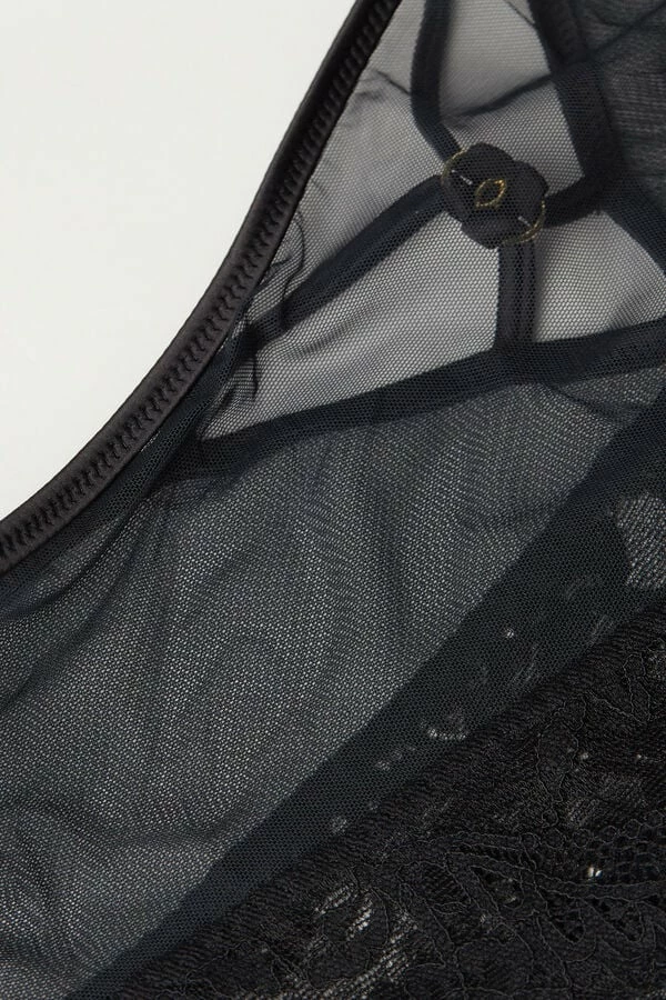 Hipster Brazilian in stretch lace and tulle with sensual satin motifs in back. Small gold jewel effect ring detail. Back part in doubled tulle. Inner gusset in 100% cotton.