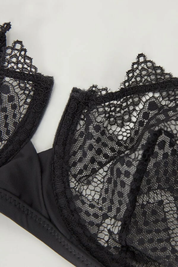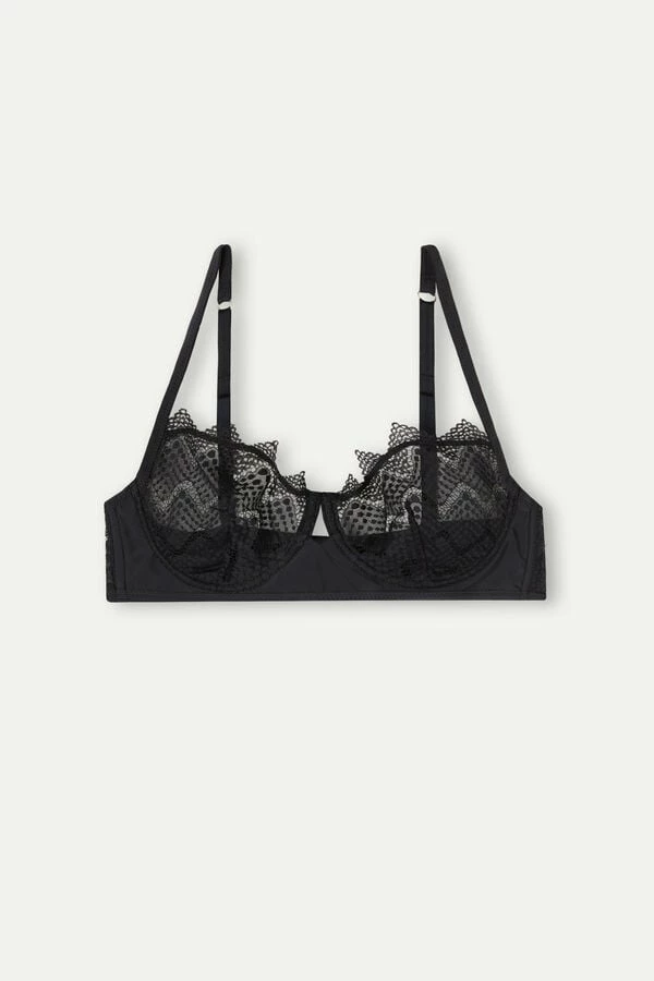 Balconette bra with underwire and side boning. Made with an elegant stretch lace with an ethnic-inspired geometric design and finished with a soft ultra-light microfiber. Special detail of a small opening in the center of the breast with a delicate superimposition of microfiber. The straps are lined with microfiber and are adjustable in back. A design that highlights the dΓ©colletΓ© for a feminine and sensual style. The model is 5β 9β (175 cm) tall and is wearing a size 2B / 75B / 34B / 85B / 42B.