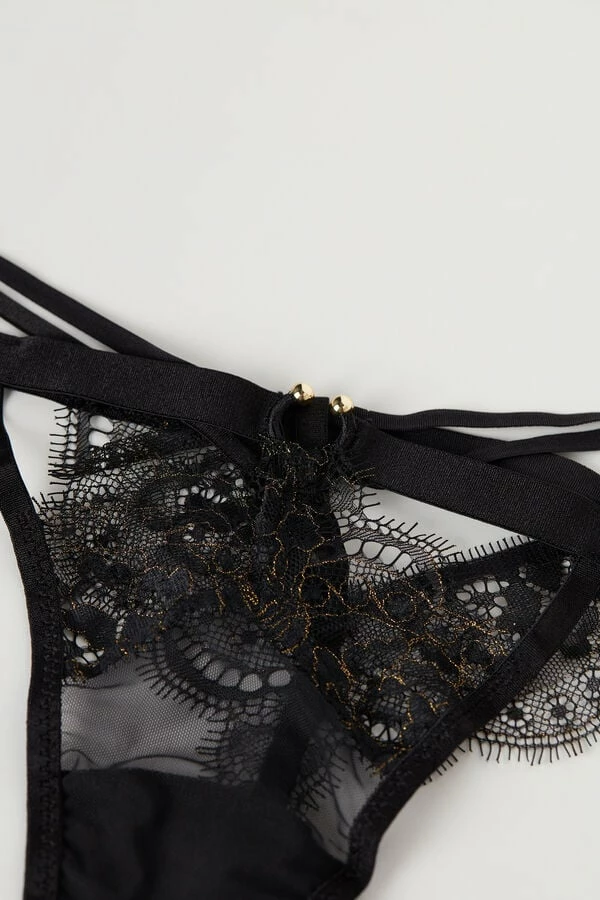 Thong in floral lace embellished with a gold lamΓ© thread with gold piercing style accessory at the waistband. It features an elasticized motif worn at the waist. Inner gusset in 100% cotton.